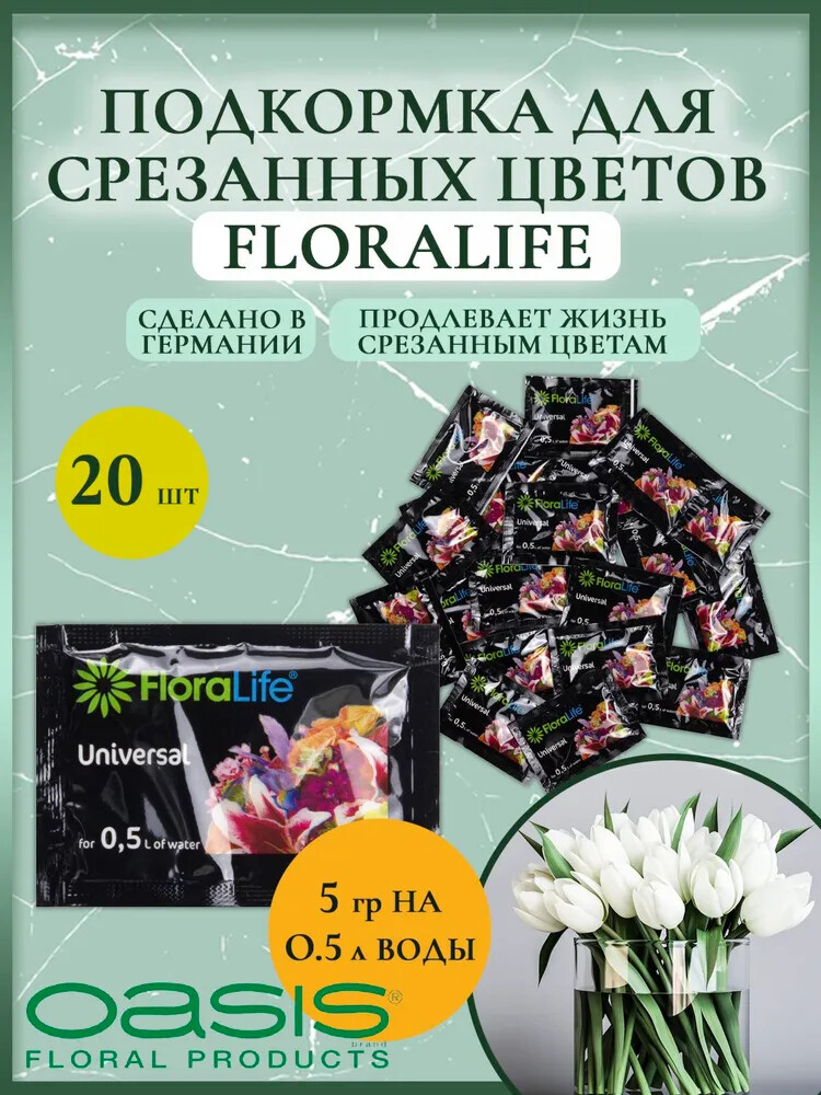 Floralife Flower Food Clear - специальная подкормка для срезанных цветов, продлевающая жизнь букета в полтора-два раза с сохранением яркости и свежего вида лепестков. Благодаря надёжности, простоте использования и эффективности, её можно использовать для праздников, торжеств, а также в домашних условиях. Средство для срезанных цветов подходит для любого вида растений и содержит оптимальную концентрацию питательных веществ для 0,5 литра воды. Также он предотвращает развитие бактерий, не даёт воде зацвести и при этом полностью в ней растворяется, без осадка или мутности.
